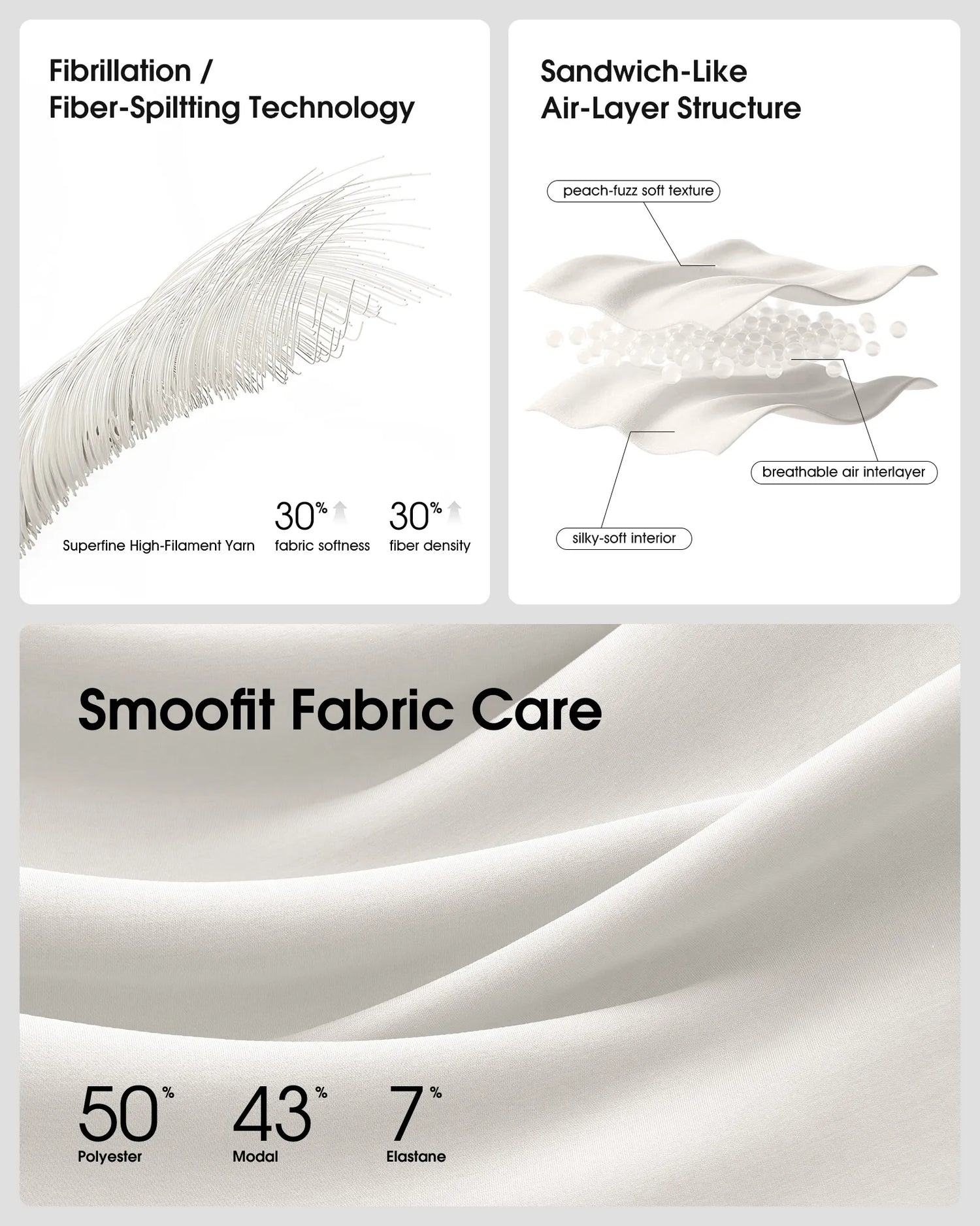 Smoofit low-weight fabric, silky smooth with peach-fuzz soft texture, shape retention.