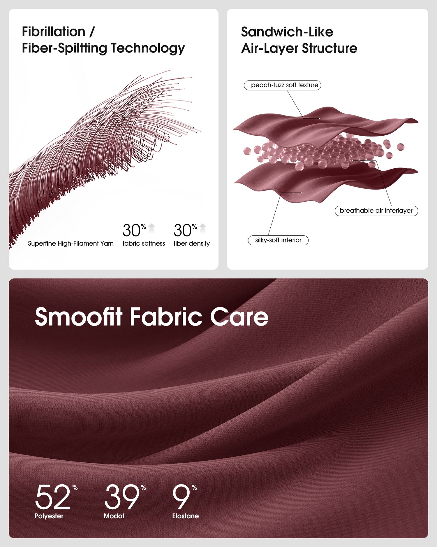 - SMOOFIT fabric has an air-layered design for a plush, peach-fuzz feel. Its advanced fiber-splitting technology ensures superior softness, wrinkle resistance, elasticity, and a graceful drape.