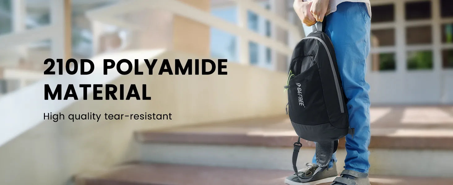 Made of lightweight, high-strength nylon fabric, the sling bag is light in weight, not easy to tear and has good load-bearing capacity. The front pocket can hold standard-sized water bottle and has added a fixing strap to make the bottle more stable