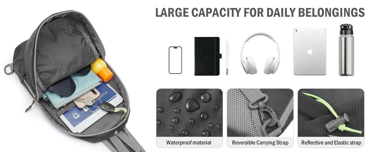 - Stay Organized at All Times: The sling bag has a main zippered pocket with 2 compartments and a reflective key chain for easy key management