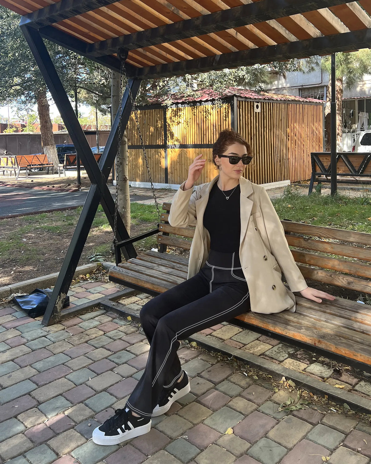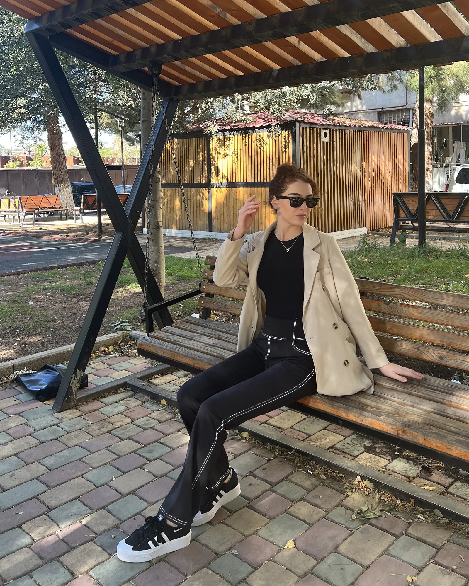 A twist on classic workwear.The multiple flares add a retro vibe, while the high waist and stretchy fabric provide a sleek, modern fit.